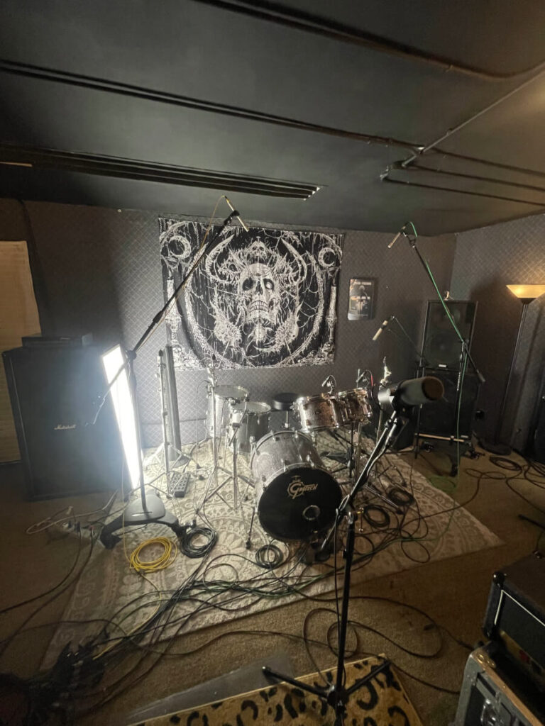 In order to record the guitar and drums at the same time without there being any bleed, or drums in the guitar mics and vice versa, we stuck the guitar cab – a Marshall 1960 Lead Straight 4×12 cabinet – in an iso booth attached to the live room, which also allowed us to dial in the guitar more precisely.